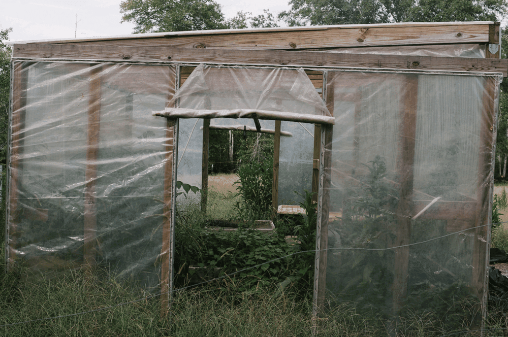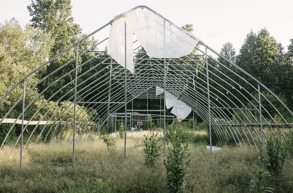We walk out to the space where the hoop house lived, to the home where the hoop house will return one day. But currently, we’re standing in the shadow, under a skeleton of a scaffolding, plastic hanging from the edge of what was before Hurricane Helene left its mark.
